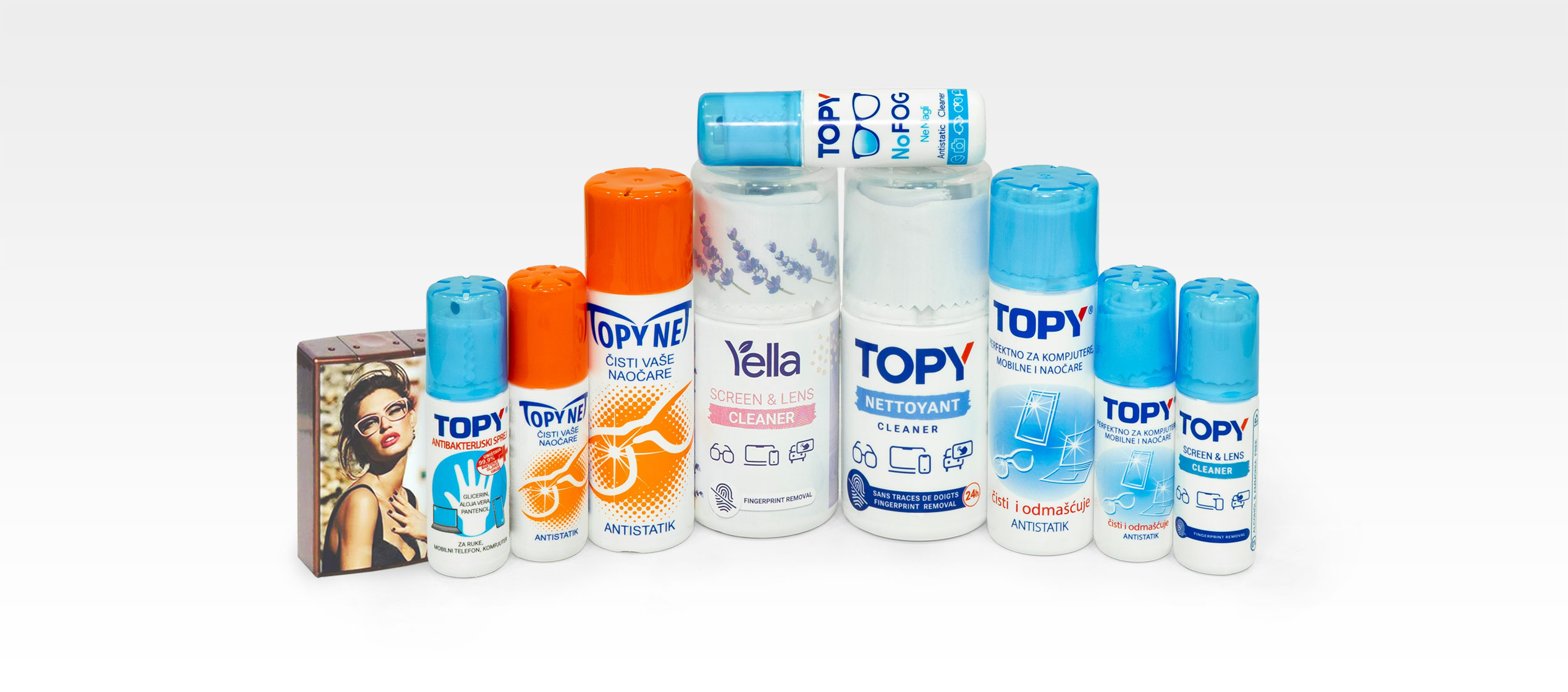 Спреи TOPY, TOPYNET и YELLA — ваши союзники для чистых и безопасных поверхностей! Они эффективно дезинфицируют и удаляют бактерии, вирусы и грибки с ваших очков и экранов мобильных телефонов. Благодаря антистатическому и антибактериальному действию ваши поверхности остаются чистыми дольше, не повреждая антибликовое покрытие. Формула действует мгновенно, быстро и эффективно на поверхности!